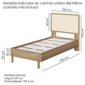Cama Solteiro 27058 combina design escandinavo com praticidade para o dia a dia. Estrutura em MDP (15/25 mm) e acabamento em pintura BP. No estilo minimalista, é composta por aplique de tela sintética (PVC com poliéster), pés em madeira maciça eucalipto (centrais em MDP 25 mm) e furação extra na cabeceira para ajuste de altura na montagem. Medidas indicadas do colchão solteiro: 88x188 cm (não acompanha colchão). Produto entregue em 2 volumes.