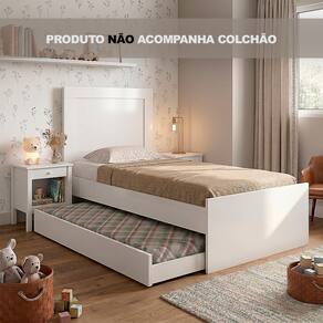 CARACTERÍSTICAS TÉCNICAS Tipo: Bicama solteiro Modelo: Luara Cor: Branco Material: MDF/MDP Tipo de pintura: UV Fosco Possui cama auxiliar: Sim Cabeceira com detalhe em relevo; Suporte anti ruído; Cama principal suporta até 90 kg; Acompanha manual de montagem; Não acompanha colchão;