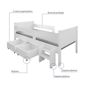 Cama Solteiro com 2 Baus Organizador e Escada Luna Plus Branco com Colchão