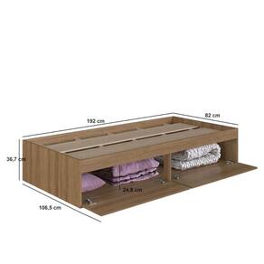 ESPECIFICAÇÕES TÉCNICAS: Cor: Madeira Material: MDP 15mm Acabamento: Finish Foil (FF) Fosco Altura: 36,7 cm Largura: 192 cm Profundidade: 82 cm Peso: 38 kg Estrado: Eucalipto/MDP, Altura de 31,7 cm do Chão Capacidade de Peso: Suporta até 110 kg Portas: 2 Basculantes com Dobradiças Metálicas Puxadores: Plástico Embutido Colchão Indicado: 190 x 80 cm (Recomendado: 78 x 188 cm) Sistema de Montagem: Parafusos e Cavilhas Complexidade da Montagem: Média Necessita Fixação na Parede: Não Produto Entregue Desmontado