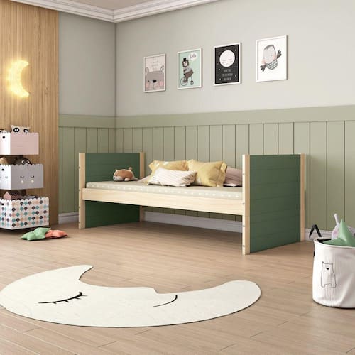 A Cama Garden é um recurso inteligente para um quarto pequeno. Pensando na segurança , há uma barra de madeira para dar maior estabilidade ao produto. E o melhor, se desejar utilizar a cama de forma única, é possível transformá-la em montessoriano com a dupla furação! Acompanha Cama Auxiliar: Não Acompanha Colchão: Não Acompanha Móbile: Não Acompanha Suporte para Mosquiteiro: Não Altura do Estrado até o Chão: 32 cm Ambiente Principal: Quarto Infantil codigo_ean: 7909903620458 Complexidade da Montagem: Alta: deve ser montado por um montador especializado Cor: Verde/Natural Cor do Produto: Verde/Natural Escala de Brilho: Semi-Brilho Itens Inclusos: 1 Cama, Kit Ferragens e Manual de Montagem Linha ou Coleção: Garden Manual de Montagem e Instalação: https://product-hub-prd.madeiramadeira.com.br/898184/documents/3f903d59-1c41-4604-acd0-346bcc69f462edeb6d12312237899880050051.pdf Material do Estrado: Madeira Material Principal: Madeira Maciça modular: Não Necessita Montagem: Sim Origem do Produto: Nacional Permite a Utilização de Cama Auxiliar: Sim Peso: 30,4 kg Possui Baú: Não Possui Gavetas: Não Possui Pés: Não Possui Portas: Não Possui Prateleiras: Não Recomendações de Uso, Manutenção e Limpeza: Na limpeza não utilizar produtos químicos e abrasivos, usar apenas um pano umedecido, para garantir a maior durabilidade do móvel. Sistema de Montagem: Parafusos e Cavilhas Suporta Até (kg): 100 kg Tamanho do Colchão Indicado (L x C): 88cm x 188 cm Tipo de Cama: Infantil Tipo de Colchão: Solteiro Tipo de Estrado: Fixo Tipo de Madeira Maciça: Pinus