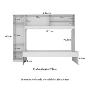 Dimensões do produto montado: Cama - Altura: 45cm | Largura: 192cm | Profundidade: 95cm Guarda-Roupas - Altura: 183cm | Largura: 240cm | Profundidade: 45cm *Você pode consultar as medidas detalhadas na imagem técnica do produto.