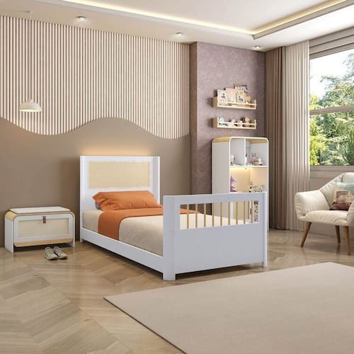 1x Cama Solteiro Juvenil Reversível em Rattan com Led Wave Branco/Natural Largura: 202,2 cm Altura: 91 cm Peso: 31 kg Profundidade: 94,2 cm Necessita Montagem: Sim