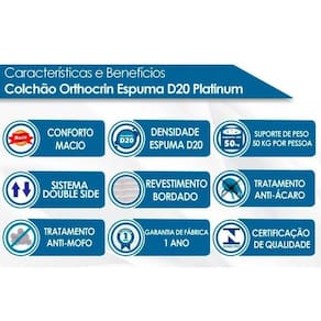 Dimensões(Cm): Comprimento(Profundidade): 188cm x Largura: 88cm x Altura: 12cm Tipo de Bordado do Tecido de Revestimento - Contínuo Tipo Tecido de Forração Revestimento - Poliéster - Bordado de Alta Qualidade Tipo de Tecido de Revestimento da Faixa Lateral - Bordado - Poliéster Tecido com Tratamento - AntiÁcaro e AntiFungo Modo de Utilização - Double Side Tipo de Estrutura do Bloco de Espuma - 20 Peso Máximo Suportado - 50 kg Tipo de Conforto - Macio Certificados de Qualidade - Qualidade Aprovada - INER Pró Espuma - Tripla Certificação Orthocrin - INMETRO Nossa Avaliação - Qualidade Boa Tempo de Garantia - 12 meses