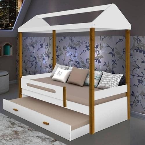 MDF 15mm / Estrado Madeira PinusCama Casa Sara Branco com Cordão de Luzes LED e Cama Auxiliar