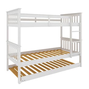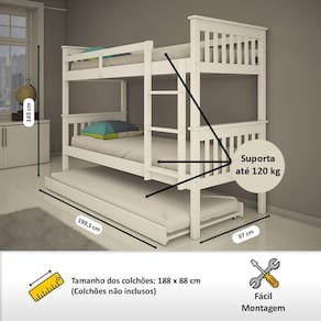 Modelo: Prime B10402 Material: Madeira Maciça de Pinus de Reflorestamento e MDF Pintura/Acabamento: Laca Branco 30% de Brilho , Podendo Aparecer os Veios da Madeira Para Colchões de Dimensões (cm x cm): 188x88 (Não Incluso) Peso Suportado Beliche: 120 Kg por cama Peso Suportado Cama Auxiliar: 120 Kg Acessórios: Escada Fixa e Cama Auxiliar com rodízios
