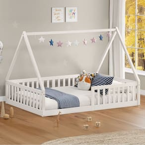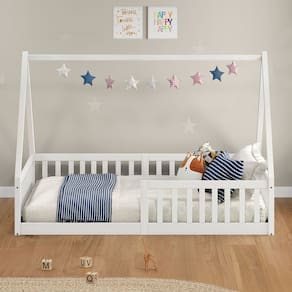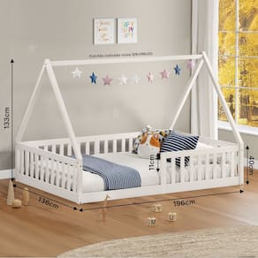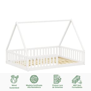 Cama Viúva Infantil Montessori Branco Madeira Casa com Estrado Stella