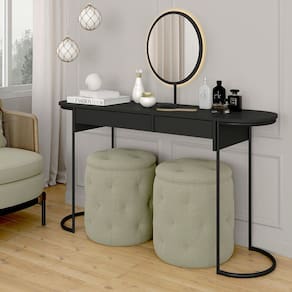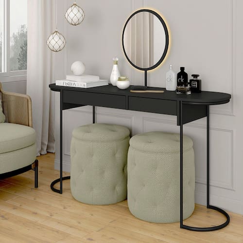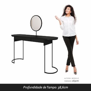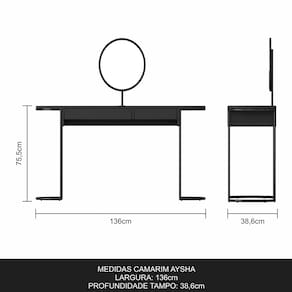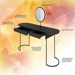 Descrição do Produto Materiais de Fabricação: - Chapa MDP 15mm / MDF 15 MM - Acabamento: Pintura UV e Pintura PU - Estrutura: Metalon - Corrediças Metálica - Possuiu 2 gavetas - As gavetas suportam até 2 kg - Acompanha espelho Com Led - Tonalidade escrivaninha: Preto Fosco - Tonalidade estrutura: Preto - Estruturado com material de altíssima qualidade, evitando fungos e mofo.