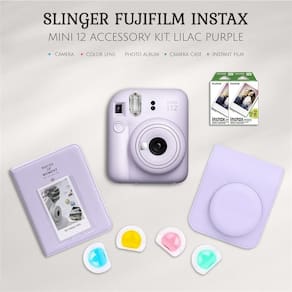 - O pacote de câmeras de filme instantâneo Fujifilm Instax Mini 12 inclui: alça de mão | 2 pilhas AA | Manual do usuário | Kit de acessórios Slinger Fujifilm Instax Mini 12 | Filme Fujifilm Instax Mini Instant Daylight — Design compacto e fofo. Gire facilmente a lente para ligar e desligar