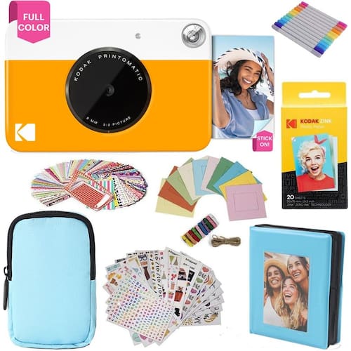 Pacote de presente com câmera de impressão instantânea KODAK Printomatic Full-Color + Estojo flexível + Papel fotográfico adesivo de zinco 2x3, pacote com 20 unidades, álbum, conjuntos de adesivos, molduras de adesivos, marcadores, molduras suspensas, presente divertido - Amarelo - Fotografia com