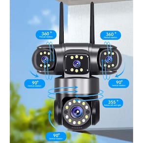 A parte superior esquerda e direita são lentes de posição fixa, 180 graus e vertical: 360 graus. A parte inferior é uma lente PTZ, horizontal 320 graus e vertical 90 graus. Tudo controlado remotamente por meio do aplicativo.