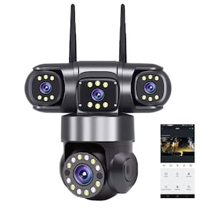 A parte superior esquerda e direita são lentes de posição fixa, 180 graus e vertical: 360 graus. A parte inferior é uma lente PTZ, horizontal 320 graus e vertical 90 graus. Tudo controlado remotamente por meio do aplicativo.