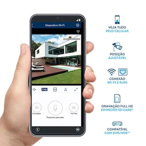 A câmera também possui microfone, comunicação bidirecional e alcance de até 30 metros com alarme para detecção de movimento e possibilidade de programar frases exclusivas para os avisos. O equipamento também é à prova dágua com certificação IP66, para você ficar ainda mais tranquilo!