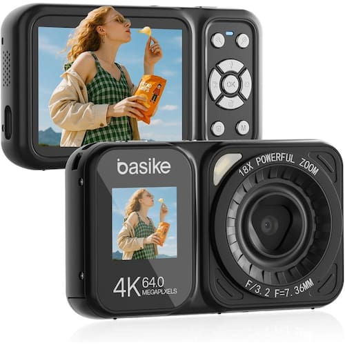 Câmera digital basike 4k 64mp dual screen tela dupla 18x Vídeo 4k uhd e fotos de 64mp - registre em 4k e 64mp com sensor cmos avançado. Alta definição sem ajustes manuais. Tela dupla: frontal e traseira - com visor traseiro de 2,8 e tela frontal de 1,4, facilite selfies e vídeos. Zoom 18x e flash embutido - zoom digital de 18x e flash automático garantem fotos claras mesmo à noite ou de longe. Modos criativos e foco automático - inclui time-lapse, temporizador e efeitos. Foco automático facilita o uso; foco manual dá mais controle. Compacta, leve e ideal para viagens - portátil e resistente, com bateria de 40 minutos e suporte para cartão sd/tf de 8-128 gb não incluso .