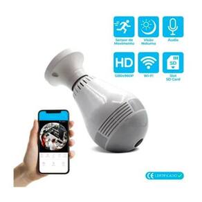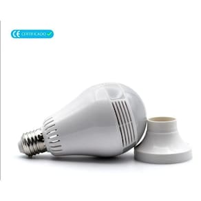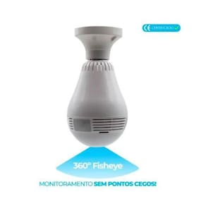 Lente: lente olho de peixe; Vista: 360 panorâmica; Entrada de áudio: microfone embutido; Entrada para cartão de memória micro sd : aceita até 128gb Tipo de soquete: e27 Tensão de funcionamento: bivolt 110/220 Tamanho máximo da imagem: 1280 x 960 pixel; Conexão: wifi através do app. Dimensão: 8 x 13 centímetros. App: dentro do manual possui o passo a passo para baixar o app