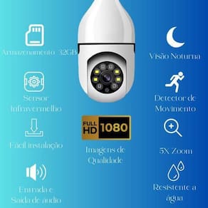 A câmera lâmpada IP 1080p é perfeita para manter a sua casa ou empresa segura 24 horas por dia. Com monitoramento pelo celular, você pode ficar tranquilo mesmo quando estiver longe. Essa câmera de segurança possui alta resolução Full HD e conta com recursos como zoom, rotação e visão noturna, garantindo imagens nítidas e detalhadas em qualquer situação.
