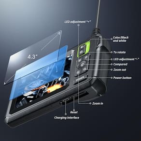 Câmera endoscópica com luz – Câmera de inspeção para endoscópio com tela IPS de 4,3 polegadas, câmera Snake HD 1920P com 8 luzes LED, escopo semirrígido de furo de cabo de 16,4 m, endoscópio à prova d'água IP67 para esgoto (verde) - Tela de alta qualidade: a câmera endoscópio com luz adota uma tela IPS de 4,3 polegadas, que pode fornecer um ângulo de visualização horizontal de aproximadamente 170°, e um chip altamente sensível que captura imagens HD de 1920 x 1080p em tempo real. Com funções de mudança de cor e mudança de brilho, você obtém imagens vivas, saturadas e naturais de qualquer ângulo. - Características poderosas da câmera: a sonda de câmera delicada do boroscópio está equipada com 8 luzes LED, que podem ajustar o brilho de acordo com o botão, para que você não precise se preocupar com o ambiente escuro. A câmera de inspeção também é à prova d'água IP67, por isso é adequada para ambientes agressivos e úmidos, e a distância de foco ideal (2 cm-10 cm) permite que você inspecione a parede do tubo com cuidado e clareza. - Cabo de dobra livre: a lente curta de 3,3 cm para inspeção de tubos estreitos tem metade do comprimento das lentes convencionais, facilitando a manobra em ângulos difíceis. A sonda de câmera de 7,9 mm e o cabo semirrígido permitem que a câmera cobra seja dobrada à vontade, facilitando o alcance de uma ampla variedade de áreas confinadas. - Operação simples: basta ligar a energia e usá-la. Não há necessidade de se conectar ao Wi-Fi com o seu smartphone ou baixar qualquer software de driver. A alça ergonômica permite que você pegue rapidamente esta câmera de esgoto leve e a use confortavelmente sem fadiga. Você também não precisa se preocupar em sujar seu telefone caro enquanto trabalha. - O pacote inclui: 1 câmera de boroscópio com luz, 1 gancho, 1 ímã, espelho lateral x 1, cabo de dados tipo-c, 1 manual x 1. Oferecemos serviço pós-venda e atencioso 24 horas. Se você tiver alguma dúvida, sinta-se à vontade para pedir ajuda.