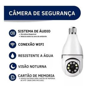 ESPECIFICAÇÕES: Aplicativo: Yoosee Cor do produto: Branco Tamanho: 15,5 x 7,1cm Lente: 3.6mm lente padrão Alta Definição: 1080p Full HD 2MP Conexão Wifi: 2.4ghz não funciona no 5GHz Microfone embutido: Canal de áudio Armazenamento por Cartão SD: Não acompanha Cartão de Memória Áudio bidirecional possibilitando a conversa entre o celular e a câmera Grau de proteção: IP44 Consumo de energia: 3w Compressão de vídeo: Smart H264 Bocal: E27 110-240V