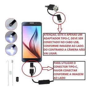 Se ao receber a câmera a tela ficar sem imagem ou toda verde ou apresentar outra anomalia, isso não é um defeito, significa que o aplicativo não é o adequado, basta enviar uma mensagem que te passaremos outro aplicativo. Se você é mecânico, eletricista, encanador, marceneiro, entre outros ou se você quer procura Aquela aliança que caiu em um ralo, no painel do carro, atrás de uma móvel, entre tantas Outra formas de usar esta incrível câmera, você achou a câmera perfeita pra você. Tudo isso você pode fazer usando seu celular ou notebook. O aplicativo indicado pelo fabricante não funciona para alguns modelos de celular, se precisar de ajuda, chame no chat que passamos os aplicativos e orientações necessárias. Compatibilidade: Não compatível com os modelos abaixo. - - samsung a01, a02 a03, a05, a7, a10, a12, a13, a22 - motorola g7, g8, g14, g52 e g20 Todos os outros smartphones da samsung, motorola funcionam normalmente. Câmera endoscópica com 5 metros de comprimento. É possível transformar seu aparelho em uma sonda, permitindo filmar e tirar fotos de lugares de difícil acesso. Câmera possui cabo de 5m a prova d'água ip67 poderá ser utilizada em encanamentos, aquários Acompanha dois suportes que podem ser fixados em sua ponta: um em forma de gancho, para fisgar objetos e outro com ponta magnética, para pegar, objetos por magnetismo. Compatibilidade: android na versão a partir de 4.4/windows 2000/vista/xp/7/8/10 32 e 64 bits e linux. Caso seu aparelho não funcione bem com o app do fabricante segue apps sugeridos: connect easycap /usb camera android11 / otg view / cameraf / usb câmera Ficha técnica: - 6 leds com ajuste de iluminação - captura imagens e grava vídeos formato jpg e vídeo avi - câmera com diâmetro de 7 mm. - resolução: 640 480 celular e 1280 720 pc - taxa de quadros: 30 fps - amplo ângulo de visão visual: 67 - distância focal: 4cm infinito. - acompanha adaptadores para usb, micro usb e tipo-c 01 endoscópio. 01 manual de instruções. 01 adaptador espelho. 01 imã. 01 gancho. 01 fixador para o gancho e para o imã 01 adaptadores micro usb x usb x tipo c