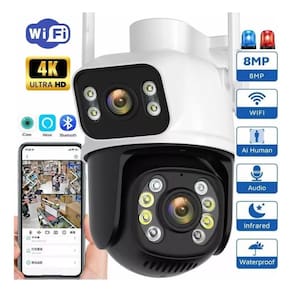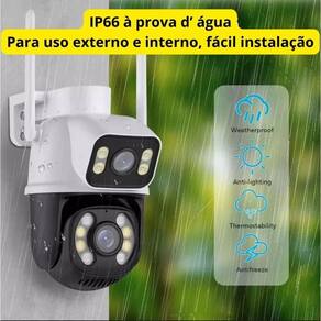 Câmera Wi-fi Ptz Lente E Tela Dupla 360 5g Prova D' Agua 6mp Descrição CARACTERÍSTICAS - 3.6mm + 6mm Dual-Lens, 2 lentes e imagem Separadamente - Tela dupla, você pode operar a tela separadamente - Câmera 6MP: Uma lente de 3MP + e outra lente de 3MP - Modo de alerta de dupla luz - Possibilita o acesso de até 10 câmeras no mesmo Aplicativo - Proteção IP66 - Alto falante e microfone para comunicação Bidirecional. você escuta e fala com quem estiver no ambiente - Alimentação: Bivolt 110V/220V - Compatível com Android 5.0 ou superior ou iOS 9.2 ou superior Câmera pode ficar até 50 metros da rede Wi-Fi. - Permite o compartilhamento com até 5 aparelhos através de senha - Navegação panorâmica com PTZ Giro horizontal 355 graus, vertical 100 graus - Formato do vídeo: Full HD 1MP / 1.3MP/2MP Recepção de sinal Wi-Fi 2.4 GHz Disponível em todos os pontos de banda larga do Brasil ou cabo de rede RJ45 Suporta cartão de memória micro SD até 128GB - Temos Kits com Cartões, links logo abaixo. - Visão noturna com infravermelho: até 15 metros - Lente 3.6mm - Alcance de visão de 30 metros - Conta com alarme e notificação direto no celular - Grava o tempo todo ou somente quando detecta algo. configurável dentro do app