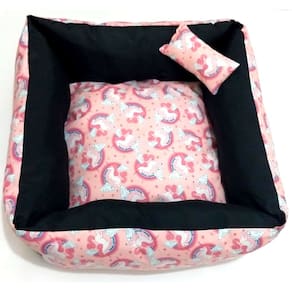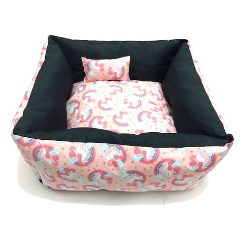Caminha para cachorros e gatos; Tecido 100% algodão; Enchimento antialérgico; TNT altamente reforçado; Todo revestido em zíper, o que facilita a retirada da capa para lavar; Formato quadrado; Todas as caminhas acompanham travesseiro em formato retangular; Cor: Rosa estampa do unicórnio; Tamanho M Medidas aproximadas: 60 cm X 60 cm, e 25 cm de altura Estampa conforme foto; Muito macio, confortável, e durável. Marca: Nica pet