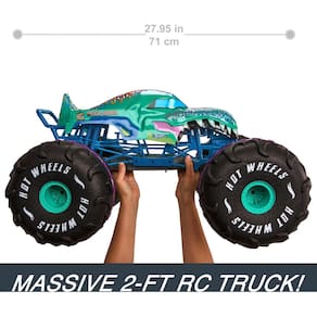 Mega-Wrex Hot Wheels RC Monster Trucks em escala 1:6, caminhão de brinquedo grande com controle remoto, pneus todo-terreno, mais de 2 pés de comprimento — Domine a competição com o extragrande Hot Wheels Monster Truck RC 1:6 th Mega-Wrex. - Este feroz caminhão de brinquedo com controle remoto tem pneus todo-o-terreno para percorrer várias paisagens e até mesmo carros de brinquedo em escala 1:64. (Carros adicionais vendidos separadamente.) - Apoie-o na barra de rodas e mostre seu estilo em duas rodas. - O caminhão em si carrega por meio do cabo USB incluído e opera em uma frequência de 2,4 GHz para bater e quebrar sem interferência de outros dispositivos de controle remoto. - Crianças de 5 anos ou mais vão adorar esse incrível caminhão RC que mede mais de 2 pés de comprimento.