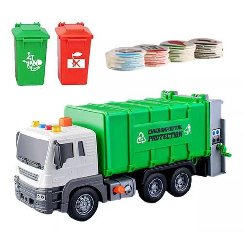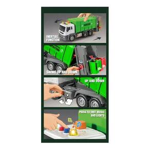 O caminhão de coleta de lixo tem um formato realista para imitar a aparência e a função de um caminhão de lixo real, função de despejo de lixo, lata de lixo removível, etc., tornando-o um ótimo complemento para qualquer coleção de brinquedos.