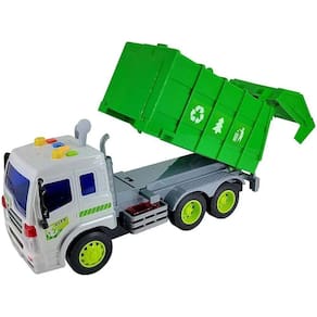 Caminhão De Lixo com Luz e Som + Fricção, a caçamba levanta após ser acionada por um botão, a porta da caçamba abre também deixando a brincadeira ainda mais divertida, o carrinho possui luz, som e fricção contínua.