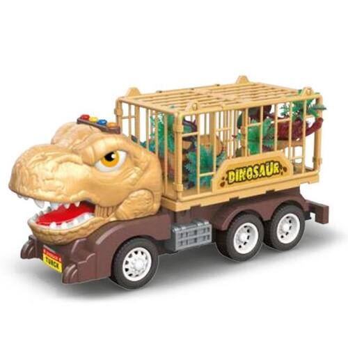 O caminhão possui um design de transporte de dinossauros dinotruck e é feito de plástico e ferro de alta qualidade. Ele vem com um dinossauro incluso e utiliza 3 baterias AG13 inclusas para funcionar. A escala é de 1:16, proporcionando uma experiência realista.