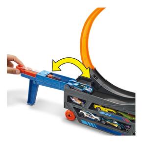 Lançamento através do loop e terra o salto uma e outra vez, ou adicionar pista adicional para um salto ainda mais longo. O transportador transformador Stunt & Go é totalmente portátil para ação atrofiante em qualquer lugar, a qualquer hora! Dobre toda a peça montada de volta, carregue seus carros na caçamba e saia rolando até o próximo show de dublês do Hot Wheels. Cada um vendido separadamente,
