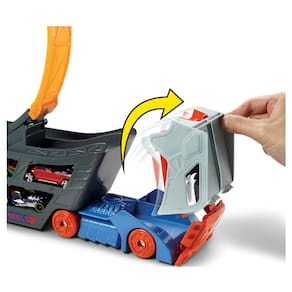 Esta plataforma incrível comporta até 18 carros, mas veja novamente, este não é um transportador comum, este é um conjunto de jogo móvel, o primeiro transportador com um loop! Estale os dois lados do loop no lugar e balance o lançador desmontável, em seguida, puxe a cabine na frente para criar um salto dramático.