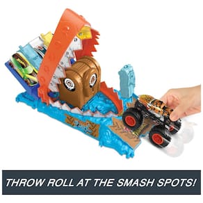 Liberte o predador indomado que é o Tiger Shark e vença o Desafio Treasure Chomp! Jogue o Hot Wheels Monster Truck Tiger Shark incluído em locais dedicados para revelar o tesouro, mas tome cuidado para não errar e ficar preso na mandíbula da armadilha! O playset fornece feedback sensorial onde as crianças podem sentir os efeitos de suas batidas e batidas nas palmas das mãos. Inclui um Hot Wheels Monster Trucks Tiger Shark fundido em escala 1:64 e 1 carro esmagado que as crianças podem adicionar às arquibancadas para maior destruição. é um ótimo brinquedo para os fãs de Monster Trucks Hot Wheels que amam o caos do universo Monster Trucks.