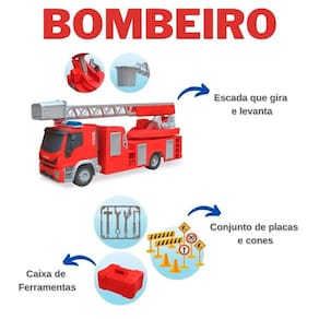 Caminhão Roda Livre - Iveco Tector Bombeiro - Usual Brinquedos: o Caminhão Iveco Bombeiro de brinquedo é um modelo Idêntico ao veículo de verdade. Perfeito para as brincadeiras e aventuras das crianças apaixonadas por caminhões. O Iveco Tector Bombeiro é um super caminhão do corpo de Bombeiros com escada articulada giratória com quatro pontos de posicionamento, cesto articulável e incríveis acessórios. Miniatura com escala de 1/30 e cheia de detalhes, deixando muito mais semelhante com o de verdade. É super divertido! Detalhes: • Caminhão com rodinhas livres • Miniatura com escala de 1/30 • Escada com pontos de posicionamento • Cesto articulável • Escada com quase 30 cm • Giro de 360° • Acompanha diversos acessórios como sinalização, cones e placas Informações: • Produto: Caminhão Iveco Tector Bombeiro • Marca: Usual Brinquedos • Coleção: Iveco • Linha: Iveco Tector • Tipo: Caminhão Bombeiro de Brinquedo • Categoria: Carrinhos e Cia • Tamanho (C x A x L): 33 x 13 x 10 cm (caminhão) • Conteúdo: - 01 Caminhão Iveco Tector Bombeiro - 01 Caixa de ferramenta miniatura - 02 Cones de sinalização - 02 Placas de “Homem Trabalhando” - 02 Placas de trânsito - 02 Barreiras - 04 Ferramentas miniatura • Recomendação: para crianças a partir de 03 anos de idade Especificações: • Referência: 583 • Código de Barras: 7898300575839 • Embalagem (C x A x L): 48.5 x 16 x 13 cm • Embalagem (Peso): 0.473 kg • Material / Composição: Polipropileno (PP) • Registro: 009 922/2019 • Certificado: Órgãos Autorizados - OCP´S (Organismos de Certificação de Produtos) Benefícios de brincar: • Eleva a autoestima • Exercita a memória • Estimula o raciocínio • Exercita o imaginário • Desenvolve a criatividade • Desenvolve percepção visual • Desperta a atenção e curiosidade • Desenvolvimento neuropsicológico • Estimula habilidades motoras básicas • Incentiva a comunicação e linguagem • Desenvolve aspectos emocionais e afetivo • Estimula o reconhecimento de formas e cores Aviso: • As imagens são meramente ilustrativas • Os pesos, tamanhos e medidas são aproximados • As cores e estampas dos produtos podem ter variações • As informações são de responsabilidade do fabricante ou fornecedor