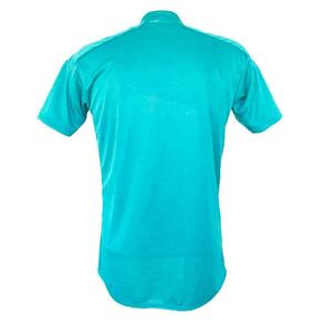 A camisa masculina é de mangas curtas, com gola em formato V.