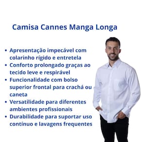 A camisa Cannes manga longa é perfeita para uniformes sociais que unem estilo e praticidade. Seu colarinho rígido com entretela garante apresentação sempre alinhada, enquanto o tecido leve e as mangas longas oferecem conforto em qualquer estação.