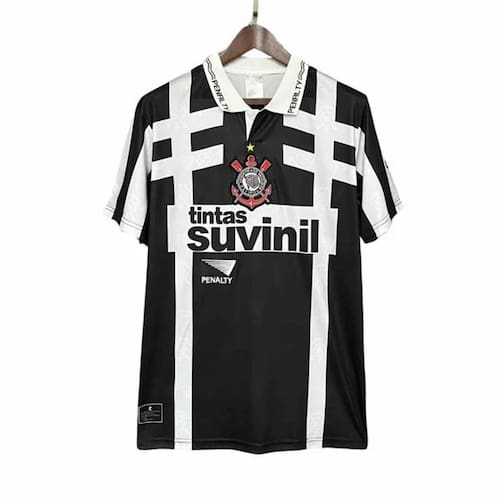 Produto: Camisa Corinthians 1995 Retrô Suvinil Cor: Preto Gola: Polo Canelada Escudo: Bordado Patrocínio: Sim Tecido: Respirável e Leve Modelagem: Tradicional