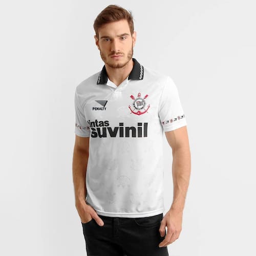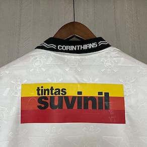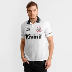 Produto: Camisa Corinthians 1995 Retrô Suvinil Cor: Branco Gola: V Canelada em Branco com botões Escudo: Bordado Patrocínio: Sim Tecido: Respirável e Leve Modelagem: Tradicional