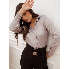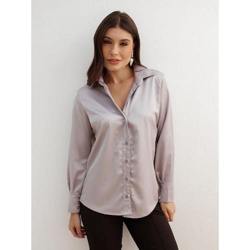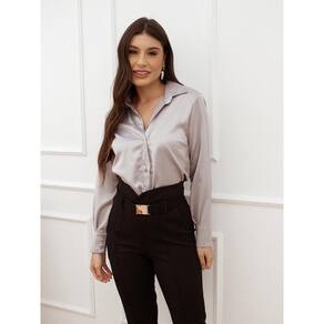 Camisa Feminina Cetim com Decote Modelagem Solta Manga Longa - Prata - GG