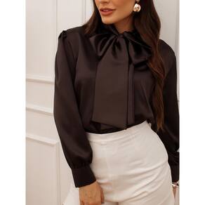 Camisa Feminina Cetim com Laço Grande Decote Manga Longa - Preto - G