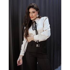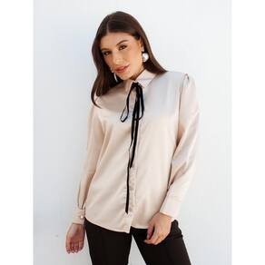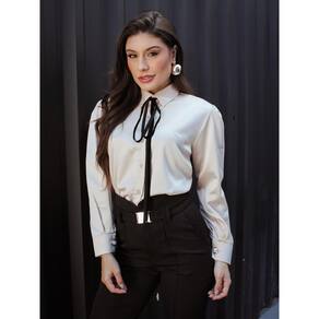 Camisa Feminina Cetim com Laço Veludo Manga Longa - Amarelo Ouro - GG