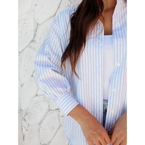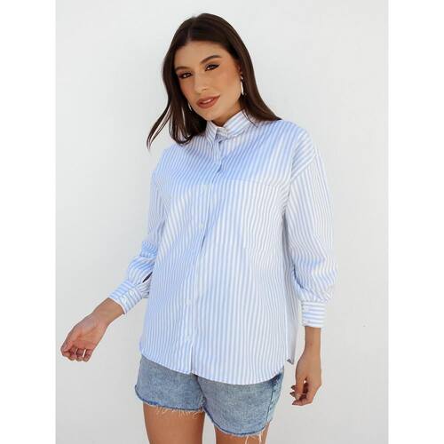 Camisa Feminina Listrada Clássica Manga Longa Alfaiataria - Azul Claro - P