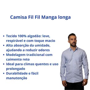 Camisa Fil a Fil Manga Longa Estilo clássico e conforto em todas as ocasiões A camisa Fil a Fil é ideal para quem busca um visual elegante com o máximo de conforto. Feita em tecido 100% algodão, ela proporciona toque suave e excelente respirabilidade, sendo perfeita para o uso diário em ambientes profissionais ou ocasiões sociais.