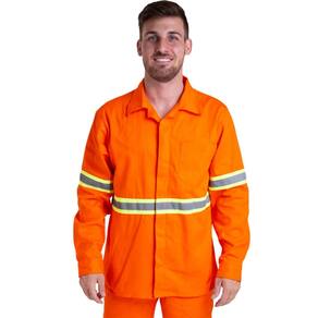 Especificações técnicas - Material: brim leve - Fechamento: botões embutidos na parte frontal - Manga: longa com botão no punho - Faixa refletiva: 2,5 cm com tecido neon verde fluorescente em frente, costas e mangas
