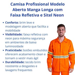 Camisa Modelo Aberto Manga Longa com Faixa Refletiva e Sitel Neon Segurança e Visibilidade no Trabalho A camisa modelo aberto possui fechamento por botões embutidos, mangas longas com botão, faixa refletiva de 2,5 cm com tecido neon verde fluorescente na frente, costas e mangas, e é confeccionada em brim leve para garantir conforto, durabilidade e alta visibilidade.