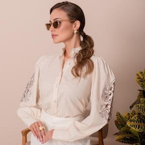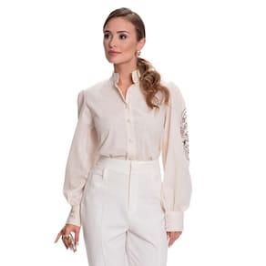 A nossa querida Camisaria Teodoro apresenta sua nova e luxuosa linha de camisas femininas. Conheçam este lindo lançamento "Teresa Teodoro" e se apaixonem! Esse modelo possui manga longa lisa em tecido flamé de algodão de alta qualidade, com aparência semelhante ao linho. Modelagem acinturada e manga longa bem bufante com bordado exuberante tipo Richelieu nas duas mangas. Colarinho padre charmoso e fechamento por botões encapados no mesmo tecido da camisa. Veste bem com calça para looks mais formais e companha também saia para um look mais romântico. Peça icônica, chique e clássica, é desejo no guarda roupa de toda mulher.