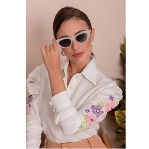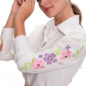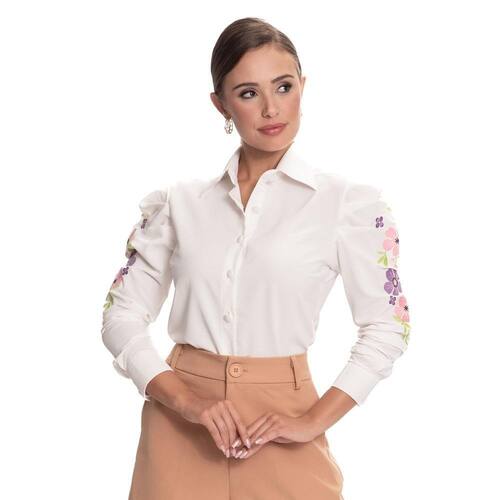 A nossa querida Camisaria Teodoro apresenta sua nova e luxuosa linha de camisas femininas. Conheçam este lindo lançamento "Teresa Teodoro" e se apaixonem! Camisa social manga longa feminina de algodão com modelagem acinturada. Manga longa bufante com lindo bordado floral em ambas as mangas. Fechamento frontal com botões encapados no mesmo tecido da peça. Veste bem com calça para looks mais formais e acompanha também saia para um look mais romântico. Peça muito clássica e atemporal, é desejo no guarda roupa de toda mulher.