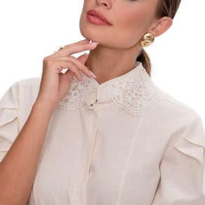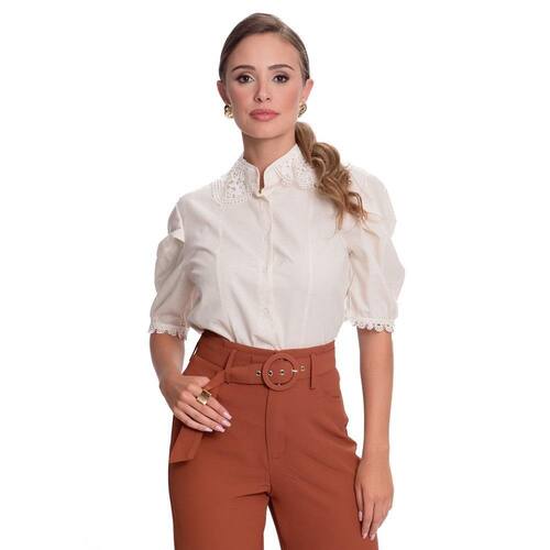 A nossa querida Camisaria Teodoro apresenta sua nova e luxuosa linha de camisas femininas. Conheçam este lindo lançamento "Teresa Teodoro" e se apaixonem!Este modelo é confeccionado em tecido de linho e algodão. Modelagem acinturada, manga bufante arrematada com renda na cor do tecido e elástico sob a renda para deixar a manga ainda mais volumosa, caso deseje ajustar. Colarinho com gola de renda e fechamento frontal com a frente invisível, os botões não ficam aparentes.