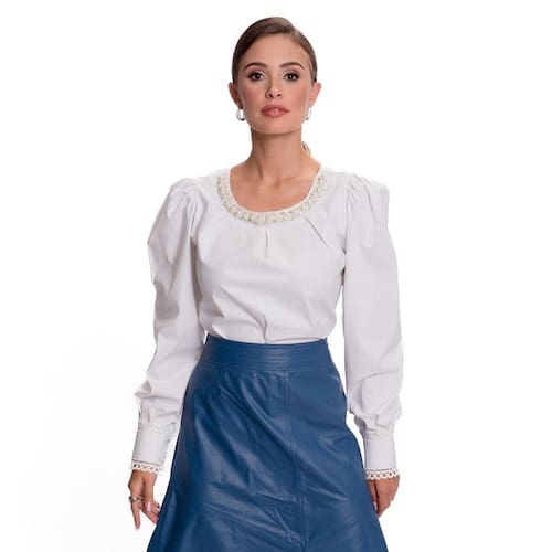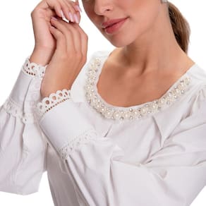 A nossa querida Camisaria Teodoro apresenta sua nova e luxuosa linha de camisas femininas. Conheçam este lindo lançamento "Teresa Teodoro" e se apaixonem! Esta peça tem modelagem reta, manga longa bufante com punho largo contornado por renda nas duas pontas. O decote redondo ganha acabamento em pedraria, pérolas e strass, com brilho único. Peça de modelagem mais ampla. É aquela peça especial no guarda roupa da mulher moderna, muito chique e atemporal.