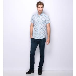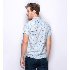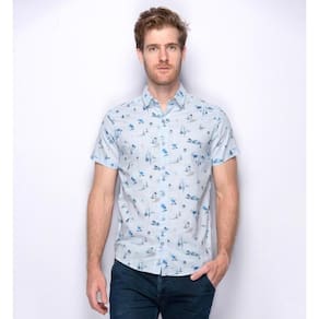 Camisa social manga curta em algodão e linho, totalmente confeccionada com matérias primas nobres. Estampa exclusiva Teodoro com motivos de praia. Corte slim fit, botões personalizados, barra levemente arredondada e mangas mais justas desde a axila, que se ajustam perfeitamente ao corpo. Gola esportiva de peso leve, e logo da marca em couro.