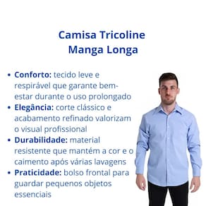 Camisa Tricoline Manga Longa Sofisticação e Conforto para seu Dia a Dia A camisa tricoline manga longa é confeccionada em tecido 100% algodão tricoline de alta qualidade, com colarinho rígido com entretela, botões na cor do tecido e um bolso superior frontal, oferecendo elegância e praticidade em ambientes formais.